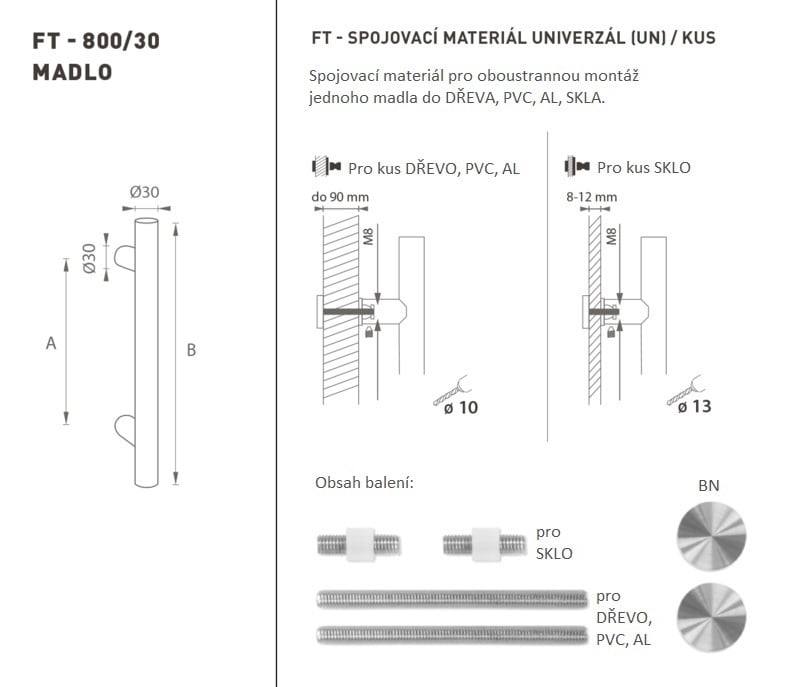 Madlo na dveře je vyrobeno z vysoce kvalitní nerezavějící oceli, známé jako nerez a je povrchově upraveno. Profil madla je 30 mm. Sada UNIVERZÁL (UN) obsahuje spojovací materiál pro oboustrannou montáž jednoho madla do dřeva, PVC, AL, skla.