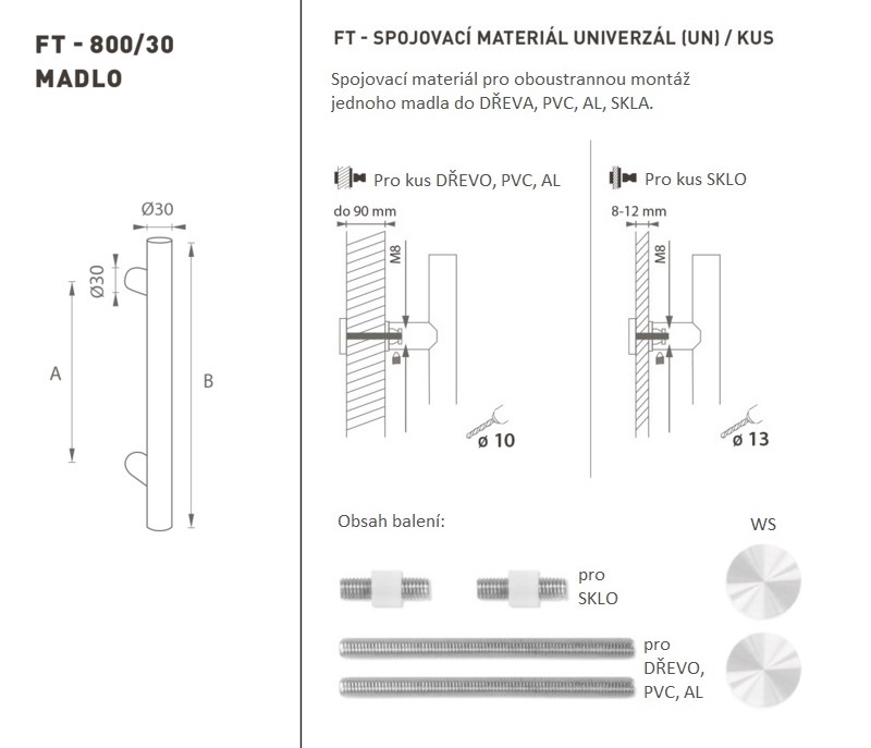 Madlo na dveře je vyrobeno z vysoce kvalitní nerezavějící oceli, známé jako nerez a je povrchově upraveno. Profil madla je 30 mm. Sada UNIVERZÁL (UN) obsahuje spojovací materiál pro oboustrannou montáž jednoho madla do dřeva, PVC, AL, skla.