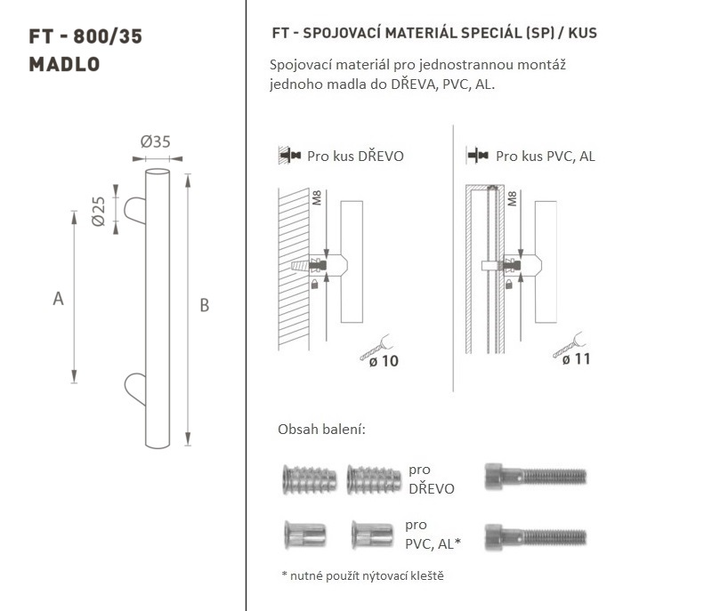Madlo na dveře je vyrobeno z vysoce kvalitní nerezavějící oceli, známé jako nerez a je povrchově upraveno. Profil madla je 35 mm. Sada SPECIÁL (SP) obsahuje spojovací materiál pro jednostrannou montáž jednoho madla do dřeva, PVC, AL.