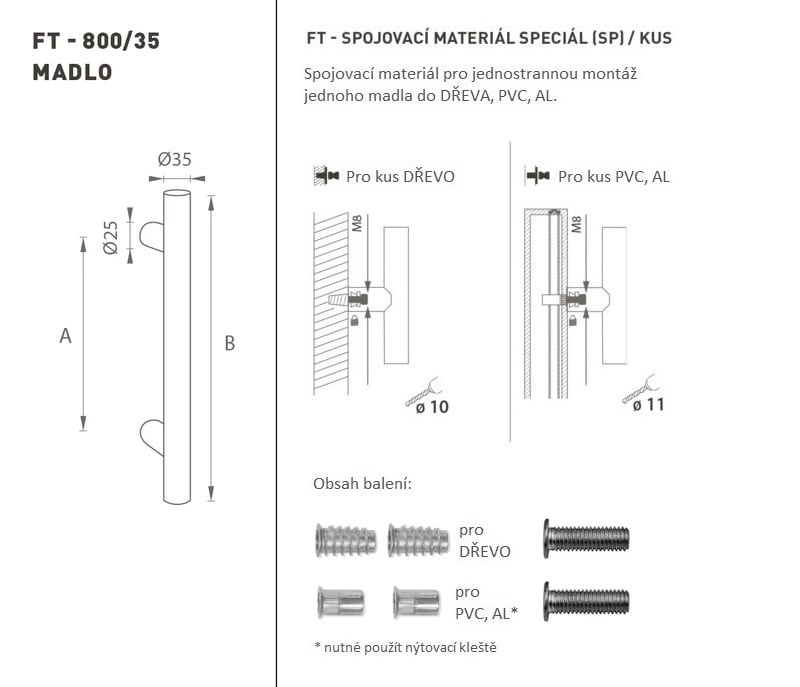 Madlo na dveře je vyrobeno z vysoce kvalitní nerezavějící oceli, známé jako nerez a je povrchově upraveno. Profil madla je 35 mm. Sada SPECIÁL (SP) obsahuje spojovací materiál pro jednostrannou montáž jednoho madla do dřeva, PVC, AL.