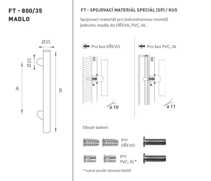 Madlo na dveře je vyrobeno z vysoce kvalitní nerezavějící oceli, známé jako nerez a je povrchově upraveno. Profil madla je 35 mm. Sada SPECIÁL (SP) obsahuje spojovací materiál pro jednostrannou montáž jednoho madla do dřeva, PVC, AL.
