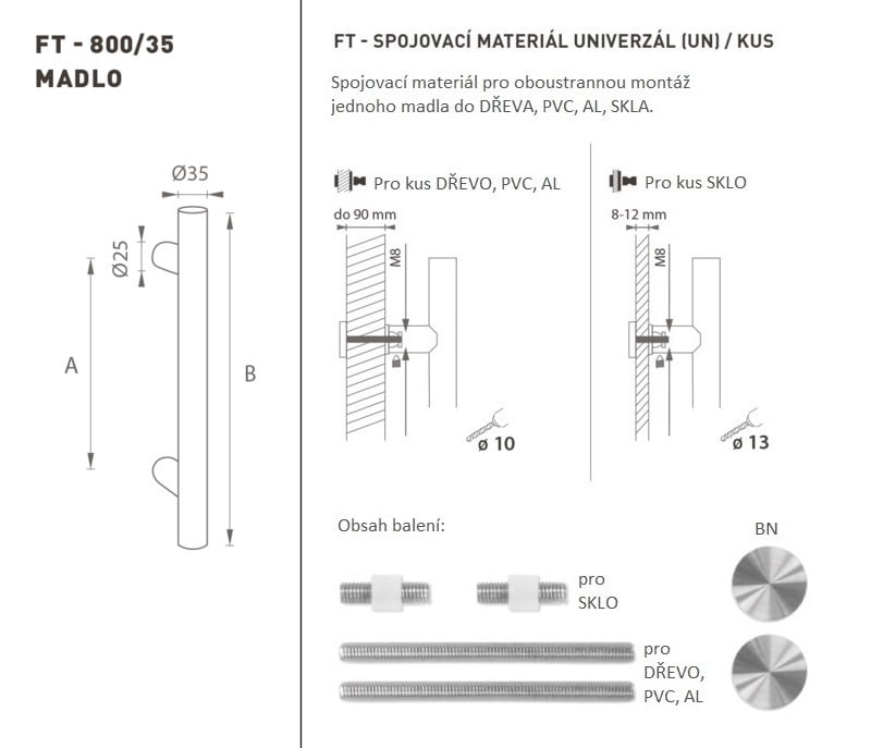 Madlo na dveře je vyrobeno z vysoce kvalitní nerezavějící oceli, známé jako nerez a je povrchově upraveno. Profil madla je 35 mm. Sada UNIVERZÁL (UN) obsahuje spojovací materiál pro oboustrannou montáž jednoho madla do dřeva, PVC, AL, skla.