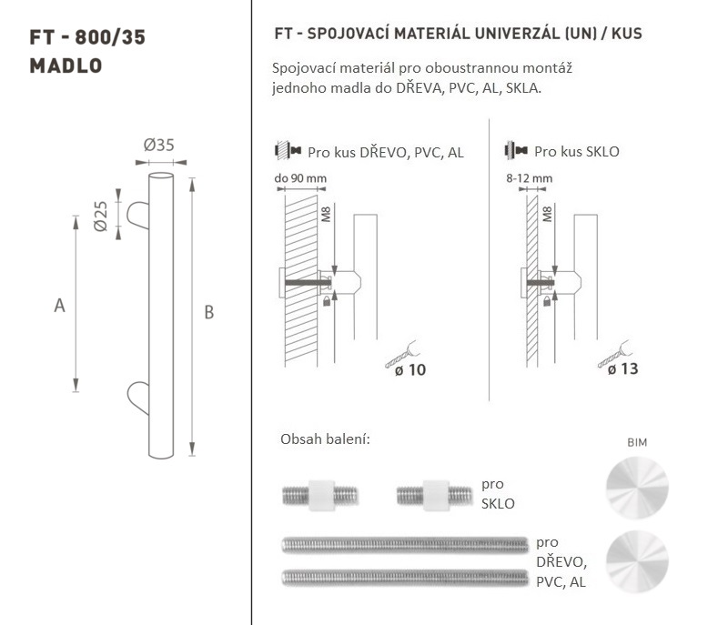 Madlo na dveře je vyrobeno z vysoce kvalitní nerezavějící oceli, známé jako nerez a je povrchově upraveno. Profil madla je 35 mm. Sada UNIVERZÁL (UN) obsahuje spojovací materiál pro oboustrannou montáž jednoho madla do dřeva, PVC, AL, skla.