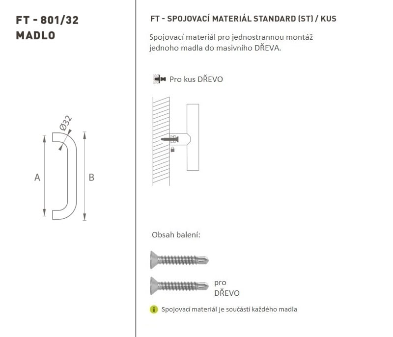 Madlo na dveře je vyrobeno z vysoce kvalitní nerezavějící oceli, známé jako nerez a je povrchově upraveno. Profil madla je 32 mm. Součástí madla jsou vruty 6 x 45 mm.