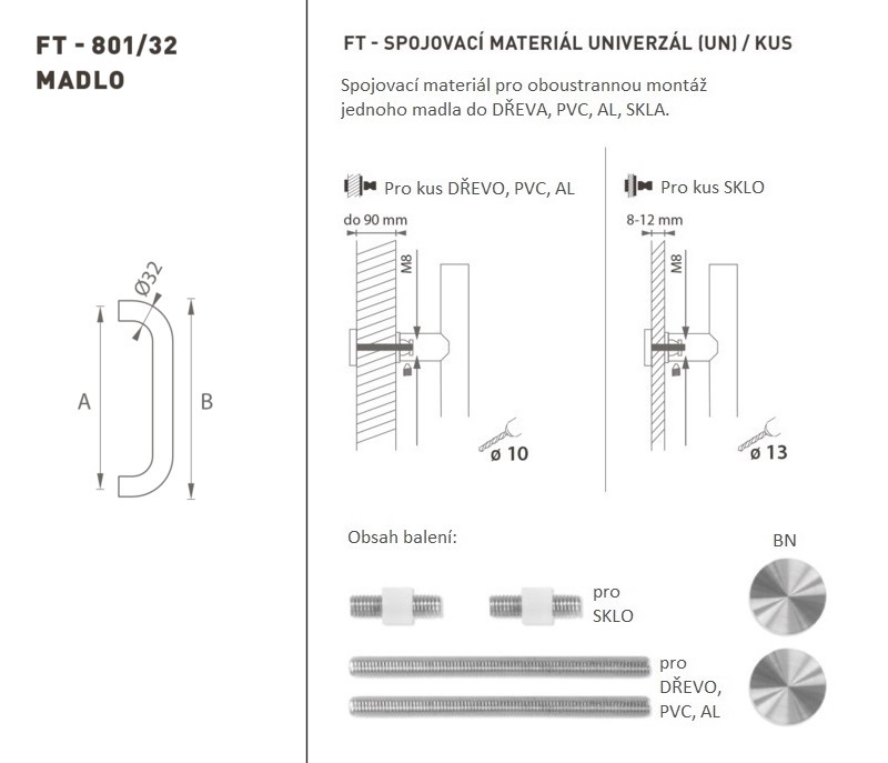 Madlo na dveře je vyrobeno z vysoce kvalitní nerezavějící oceli, známé jako nerez a je povrchově upraveno. Profil madla je Ø 32 mm. Sada UNIVERZÁL (UN) obsahuje spojovací materiál pro oboustrannou montáž jednoho madla do dřeva, PVC, AL, skla.