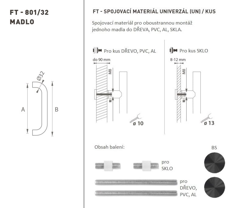 Madlo na dveře je vyrobeno z vysoce kvalitní nerezavějící oceli, známé jako nerez a je povrchově upraveno. Profil madla je 32 mm. Sada UNIVERZÁL (UN) obsahuje spojovací materiál pro oboustrannou montáž jednoho madla do dřeva, PVC, AL, skla.
