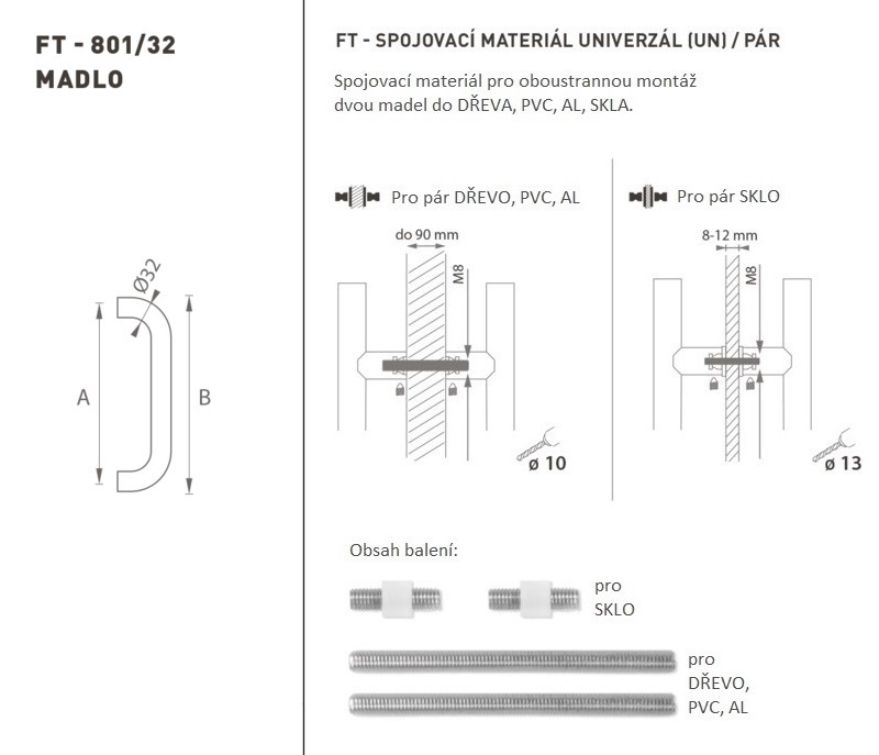 Madlo na dveře je vyrobeno z vysoce kvalitní nerezavějící oceli, známé jako nerez a je povrchově upraveno. Profil madla je 32 mm. Sada UNIVERZÁL (UN) obsahuje spojovací materiál pro oboustrannou montáž dvou madel do dřeva, PVC, AL, skla.