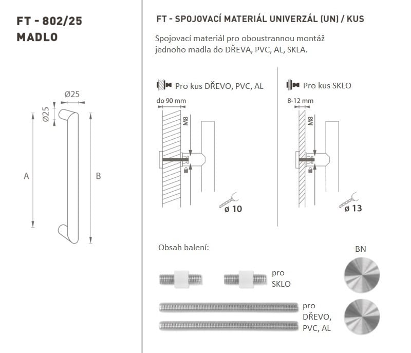 Madlo na dveře je vyrobeno z vysoce kvalitní nerezavějící oceli, známé jako nerez a je povrchově upraveno. Profil madla je 25 mm. Sada UNIVERZÁL (UN) obsahuje spojovací materiál pro oboustrannou montáž jednoho madla do dřeva, PVC, AL, skla.