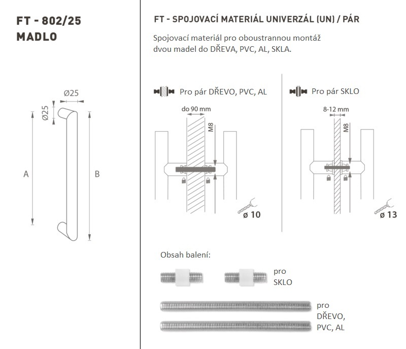 Madlo na dveře je vyrobeno z vysoce kvalitní nerezavějící oceli, známé jako nerez a je povrchově upraveno. Profil madla je 25 mm. Sada UNIVERZÁL (UN) obsahuje spojovací materiál pro oboustrannou montáž dvou madel do dřeva, PVC, AL, skla.