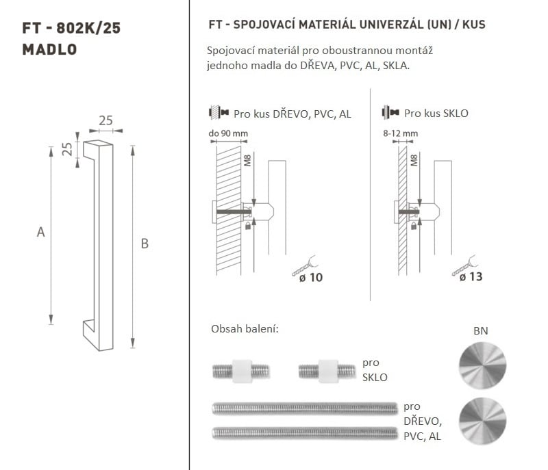 Madlo na dveře je vyrobeno z vysoce kvalitní nerezavějící oceli, známé jako nerez a je povrchově upraveno. Profil madla je 25 x 25 mm. Sada UNIVERZÁL (UN) obsahuje spojovací materiál pro oboustrannou montáž jednoho madla do dřeva, PVC, AL, skla.