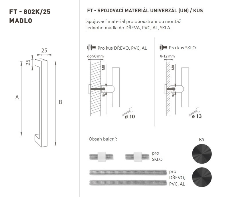 Madlo na dveře je vyrobeno z vysoce kvalitní nerezavějící oceli, známé jako nerez a je povrchově upraveno. Profil madla je 25 x 25 mm. Sada UNIVERZÁL (UN) obsahuje spojovací materiál pro oboustrannou montáž jednoho madla do dřeva, PVC, AL, skla.