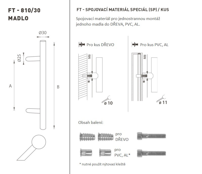 Madlo na dveře je vyrobeno z vysoce kvalitní nerezavějící oceli, známé jako nerez a je povrchově upraveno. Profil madla je 30 mm. Sada SPECIÁL (SP) obsahuje spojovací materiál pro jednostrannou montáž jednoho madla do dřeva, PVC, AL. Madlo s délkou 1600, 1800 a 2000 mm má 3 úchyty.