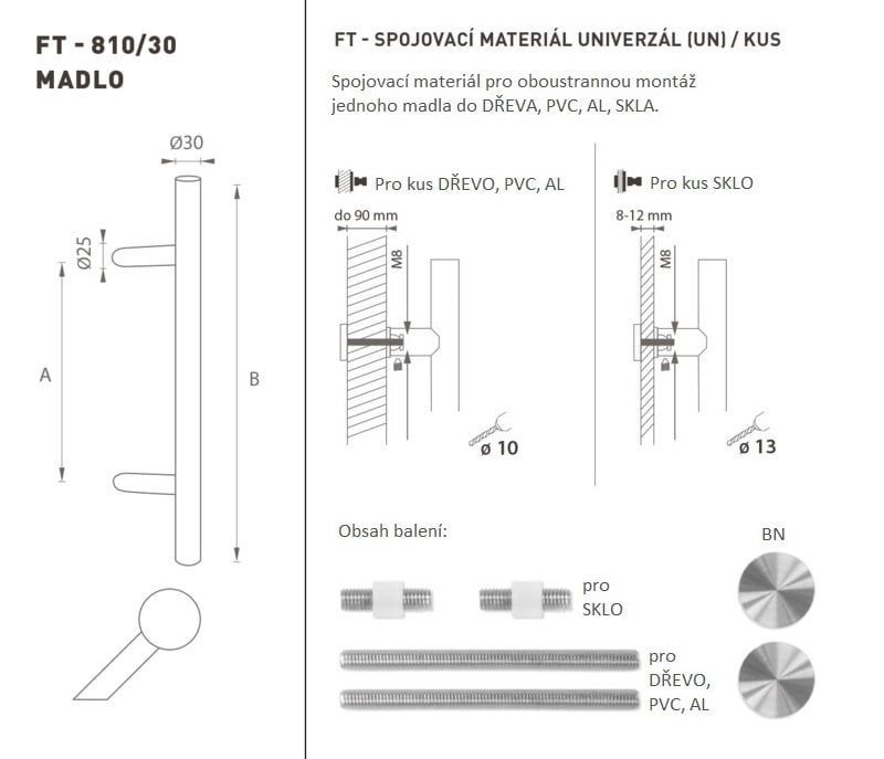 Madlo na dveře je vyrobeno z vysoce kvalitní nerezavějící oceli, známé jako nerez a je povrchově upraveno. Profil madla je 30 mm. Sada UNIVERZÁL (UN) obsahuje spojovací materiál pro oboustrannou montáž jednoho madla do dřeva, PVC, AL, skla. Madlo s délkou 1600, 1800 a 2000 mm má 3 úchyty.