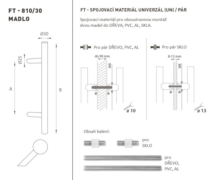 Madlo na dveře je vyrobeno z vysoce kvalitní nerezavějící oceli, známé jako nerez a je povrchově upraveno. Profil madla je 30 mm. Sada UNIVERZÁL (UN) obsahuje spojovací materiál pro oboustrannou montáž dvou madel do dřeva, PVC, AL, skla. Madlo s délkou 1600, 1800 a 2000 mm má 3 úchyty.