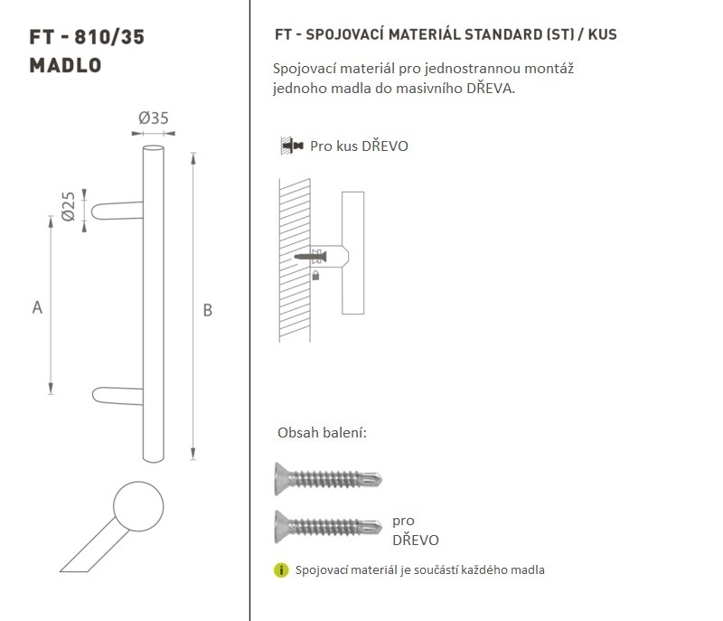 Madlo na dveře je vyrobeno z vysoce kvalitní nerezavějící oceli, známé jako nerez a je povrchově upraveno. Profil madla je 35 mm. Součástí madla jsou vruty 6x 45 mm.