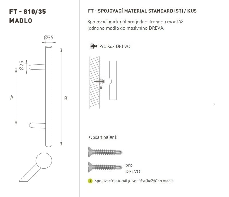 Madlo na dveře je vyrobeno z vysoce kvalitní nerezavějící oceli, známé jako nerez a je povrchově upraveno. Profil madla je 35 mm. Součástí madla jsou vruty 6 x 45 mm.