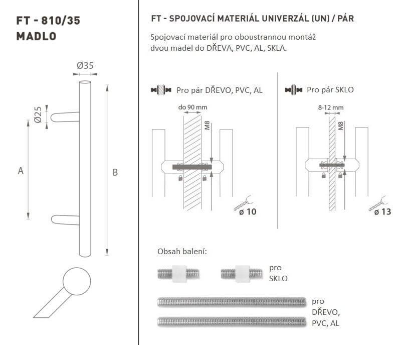 Madlo na dveře je vyrobeno z vysoce kvalitní nerezavějící oceli, známé jako nerez a je povrchově upraveno. Profil madla je 35 mm. Sada UNIVERZÁL (UN) obsahuje spojovací materiál pro oboustrannou montáž dvou madel do dřeva, PVC, AL, skla.