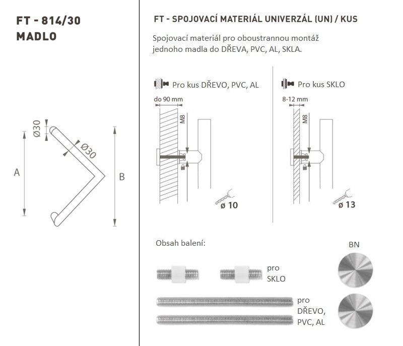 Madlo na dveře je vyrobeno z vysoce kvalitní nerezavějící oceli, známé jako nerez a je povrchově upraveno. Profil madla je 30 mm. Sada UNIVERZÁL (UN) obsahuje spojovací materiál pro oboustrannou montáž jednoho madla do dřeva, PVC, AL, skla.