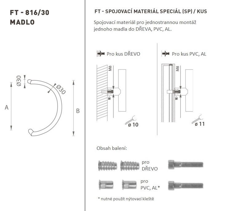 Madlo na dveře je vyrobeno z vysoce kvalitní nerezavějící oceli, známé jako nerez a je povrchově upraveno. Profil madla je 30 mm. Sada SPECIÁL (SP) obsahuje spojovací materiál pro jednostrannou montáž jednoho madla do dřeva, PVC, AL.