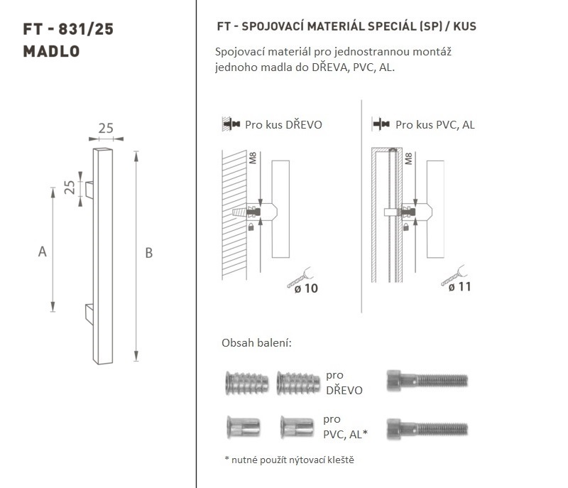Madlo na dveře je vyrobeno z vysoce kvalitní nerezavějící oceli, známé jako nerez a je povrchově upraveno. Profil madla je 25 x 25 mm. Sada SPECIÁL (SP) obsahuje spojovací materiál pro jednostrannou montáž jednoho madla do dřeva, PVC, AL.