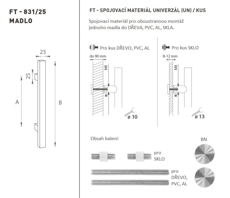 Madlo na dveře je vyrobeno z vysoce kvalitní nerezavějící oceli, známé jako nerez a je povrchově upraveno. Profil madla je 25 x 25 mm. Sada UNIVERZÁL (UN) obsahuje spojovací materiál pro oboustrannou montáž jednoho madla do dřeva, PVC, AL, skla.