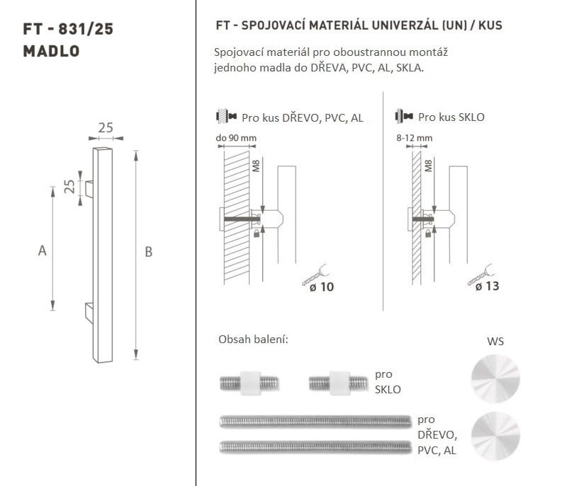 Madlo na dveře je vyrobeno z vysoce kvalitní nerezavějící oceli, známé jako nerez a je povrchově upraveno. Profil madla je 25 x 25 mm. Sada UNIVERZÁL (UN) obsahuje spojovací materiál pro oboustrannou montáž jednoho madla do dřeva, PVC, AL, skla.