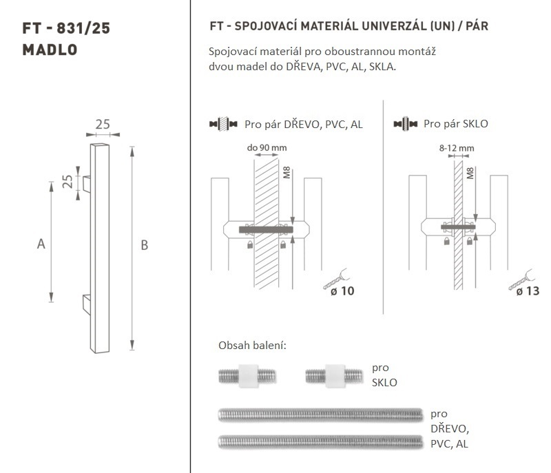 Madlo na dveře je vyrobeno z vysoce kvalitní nerezavějící oceli, známé jako nerez a je povrchově upraveno. Profil madla je 25 x 25 mm. Sada UNIVERZÁL (UN) obsahuje spojovací materiál pro oboustrannou montáž dvou madel do dřeva, PVC, AL, skla.