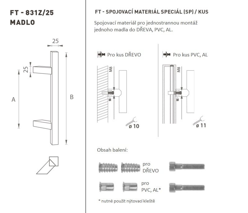 Madlo na dveře je vyrobeno z vysoce kvalitní nerezavějící oceli, známé jako nerez a je povrchově upraveno. Profil madla je 25 x 25 mm. Sada SPECIÁL (SP) obsahuje spojovací materiál pro jednostrannou montáž jednoho madla do dřeva, PVC, AL.