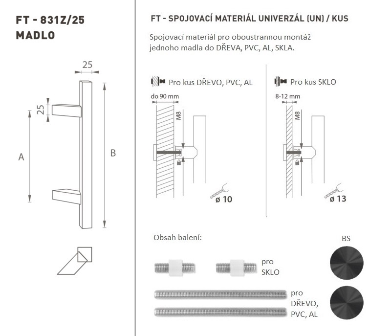 Madlo na dveře je vyrobeno z vysoce kvalitní nerezavějící oceli, známé jako nerez a je povrchově upraveno. Profil madla je 25 x 25 mm. Sada UNIVERZÁL (UN) obsahuje spojovací materiál pro oboustrannou montáž jednoho madla do dřeva, PVC, AL, skla.