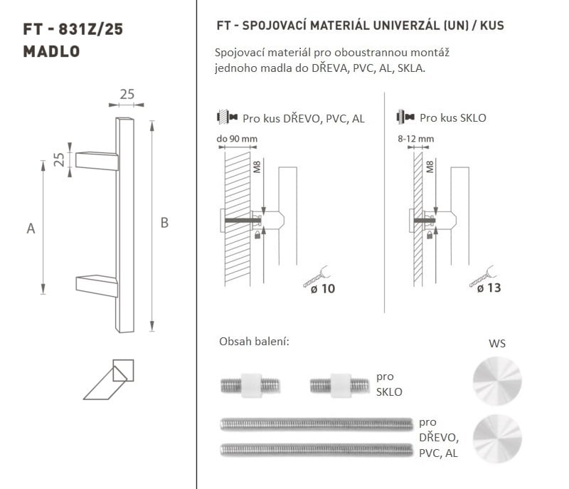 Madlo na dveře je vyrobeno z vysoce kvalitní nerezavějící oceli, známé jako nerez a je povrchově upraveno. Profil madla je 25 x 25 mm. Sada UNIVERZÁL (UN) obsahuje spojovací materiál pro oboustrannou montáž jednoho madla do dřeva, PVC, AL, skla.