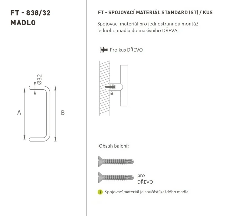 Madlo na dveře je vyrobeno z vysoce kvalitní nerezavějící oceli, známé jako nerez a je povrchově upraveno. Profil madla je 32 mm. Součástí madla jsou vruty 6 x 45 mm.