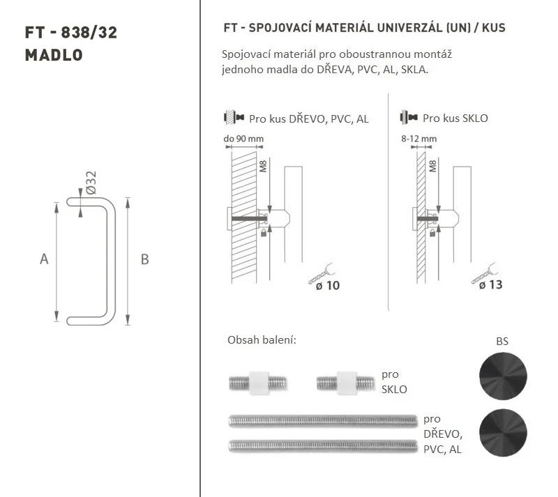 Madlo na dveře je vyrobeno z vysoce kvalitní nerezavějící oceli, známé jako nerez a je povrchově upraveno. Profil madla je Ø 32 mm. Sada UNIVERZÁL (UN) obsahuje spojovací materiál pro oboustrannou montáž jednoho madla do dřeva, PVC, AL, skla.