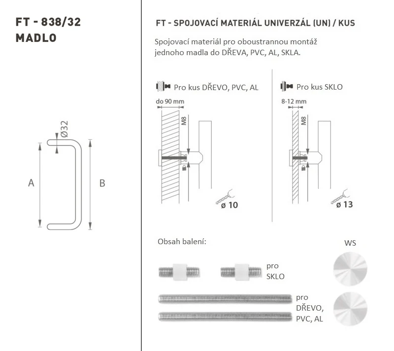 Madlo na dveře je vyrobeno z vysoce kvalitní nerezavějící oceli, známé jako nerez a je povrchově upravené. Profil madla je 32 mm. Sada UNIVERZÁL (UN) obsahuje spojovací materiál pro oboustrannou montáž dvou madel do dřeva, PVC, AL, skla.