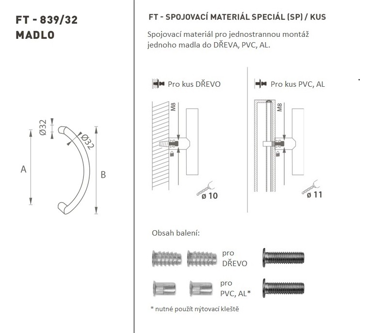 Madlo na dveře je vyrobeno z vysoce kvalitní nerezavějící oceli, známé jako nerez a je povrchově upraveno. Profil madla je 32 mm. Sada SPECIÁL (SP) obsahuje spojovací materiál pro jednostrannou montáž jednoho madla do dřeva, PVC, AL.