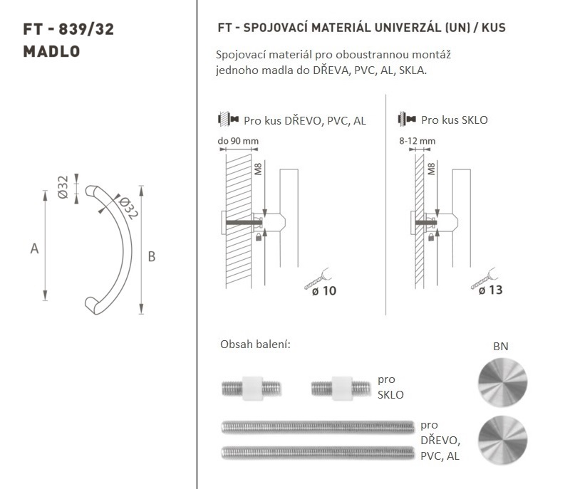 Madlo na dveře je vyrobeno z vysoce kvalitní nerezavějící oceli, známé jako nerez a je povrchově upraveno. Profil madla je Ø 32 mm. Sada UNIVERZÁL (UN) obsahuje spojovací materiál pro oboustrannou montáž jednoho madla do dřeva, PVC, AL, skla.