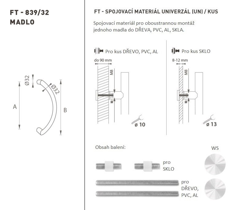 Madlo na dveře je vyrobeno z vysoce kvalitní nerezavějící oceli, známé jako nerez a je povrchově upraveno. Profil madla je Ø 32 mm. Sada UNIVERZÁL (UN) obsahuje spojovací materiál pro oboustrannou montáž dvou madel do dřeva, PVC, AL, skla.