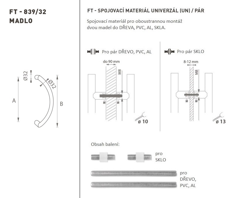 Madlo na dveře je vyrobeno z vysoce kvalitní nerezavějící oceli, známé jako nerez a je povrchově upraveno. Profil madla je Ø 32 mm. Sada UNIVERZÁL (UN) obsahuje spojovací materiál pro oboustrannou montáž dvou madel do dřeva, PVC, AL, skla.