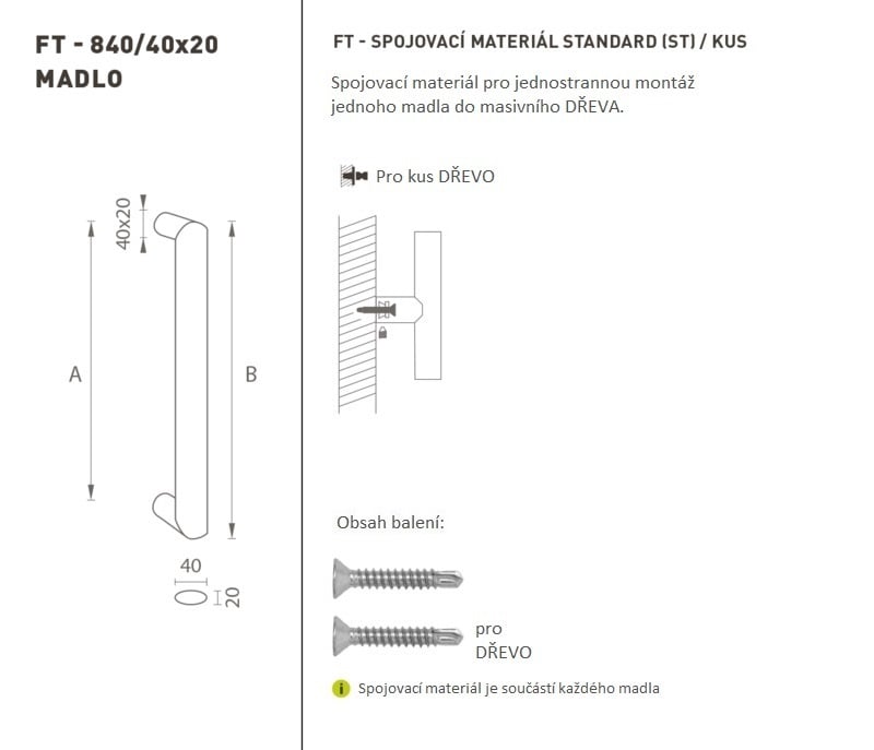 Madlo na dveře je vyrobeno z vysoce kvalitní nerezavějící oceli, známé jako nerez a je povrchově upraveno. Profil madla je 40x20 mm.  Součástí madla jsou vruty 6 x 45 mm.