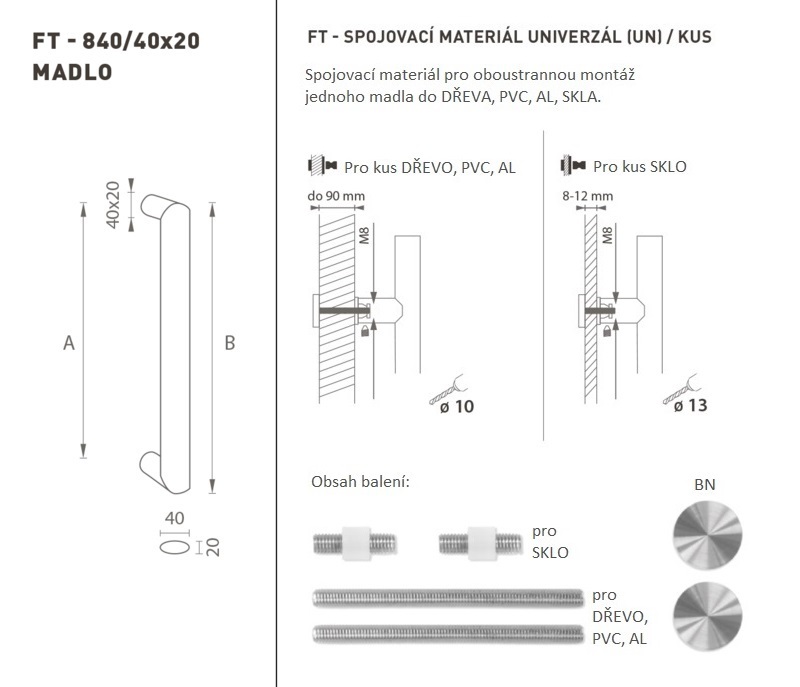 Madlo na dveře je vyrobeno z vysoce kvalitní nerezavějící oceli, známé jako nerez a je povrchově upraveno. Profil madla má rozměr 40 x 20 mm. Sada UNIVERZÁL (UN) obsahuje spojovací materiál pro oboustrannou montáž dvou madel do dřeva, PVC, AL, skla.