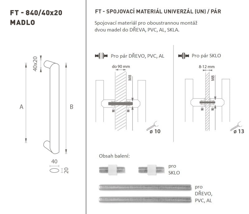 Madlo na dveře je vyrobeno z vysoce kvalitní nerezavějící oceli, známé jako nerez a je povrchově upraveno. Profil madla je 40 x 20 mm. Sada UNIVERZÁL (UN) obsahuje spojovací materiál pro oboustrannou montáž dvou madel do dřeva, PVC, AL, skla.