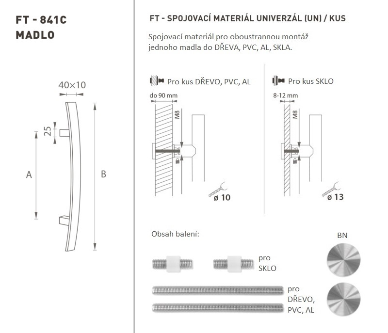Madlo na dveře je vyrobeno z vysoce kvalitní nerezavějící oceli, známé jako nerez a je povrchově upraveno. Profil madla má rozměr 40 x 10 mm. Sada UNIVERZÁL (UN) obsahuje spojovací materiál pro oboustrannou montáž dvou madel do dřeva, PVC, AL, skla.