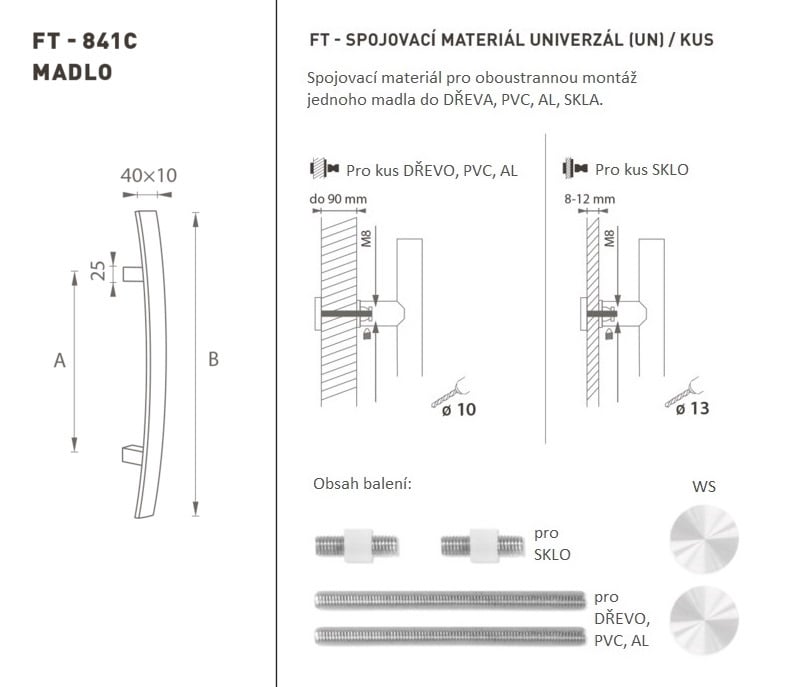Madlo na dveře je vyrobeno z vysoce kvalitní nerezavějící oceli, známé jako nerez a je povrchově upraveno. Profil madla má rozměr 40 x 10 mm. Sada UNIVERZÁL (UN) obsahuje spojovací materiál pro oboustrannou montáž dvou madel do dřeva, PVC, AL, skla.