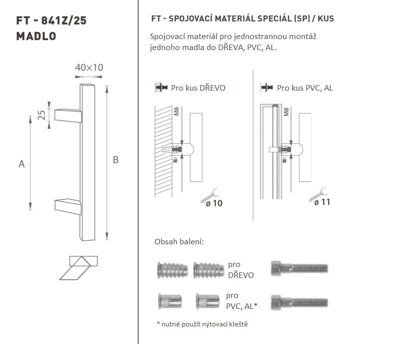 Madlo na dveře je vyrobeno z vysoce kvalitní nerezavějící oceli, známé jako nerez a je povrchově upraveno. Profil madla je 40 x 10 mm. Sada SPECIÁL (SP) obsahuje spojovací materiál pro jednostrannou montáž jednoho madla do dřeva, PVC, AL.