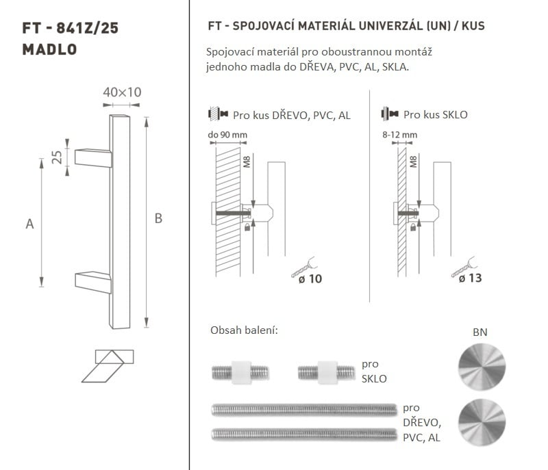 Madlo na dveře je vyrobeno z vysoce kvalitní nerezavějící oceli, známé jako nerez a je povrchově upraveno. Profil madla je 40 x 10 mm. Sada UNIVERZÁL (UN) obsahuje spojovací materiál pro oboustrannou montáž jednoho madla do dřeva, PVC, AL, skla.