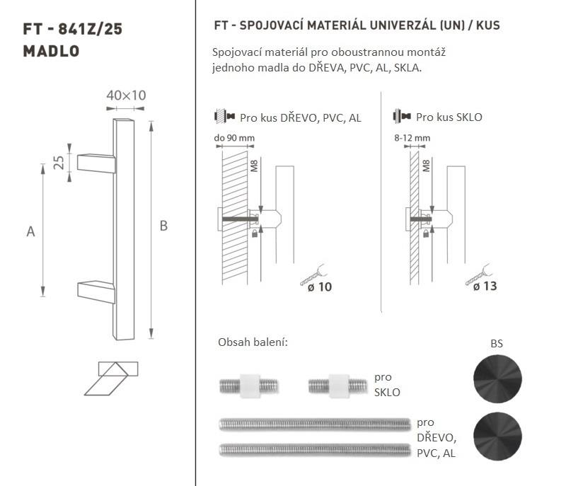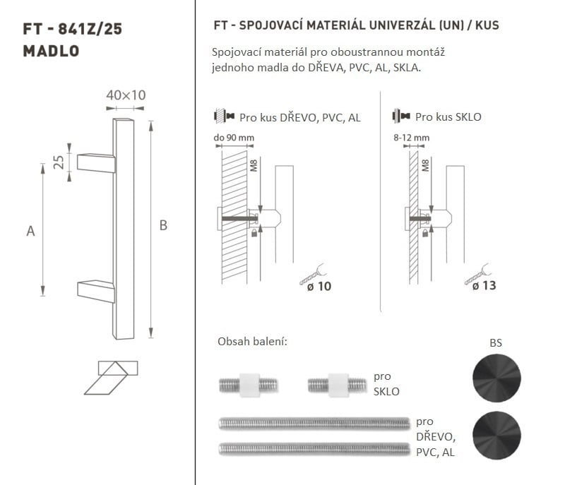 Madlo na dveře je vyrobeno z vysoce kvalitní nerezavějící oceli, známé jako nerez a je povrchově upraveno. Profil madla je 40 x 10 mm. Sada UNIVERZÁL (UN) obsahuje spojovací materiál pro oboustrannou montáž jednoho madla do dřeva, PVC, AL, skla.