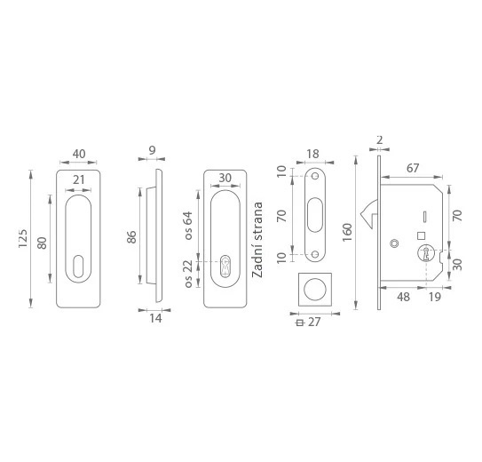 Hranatý set na posuvné dveře s otvorem pro interiérový klíč (BB).