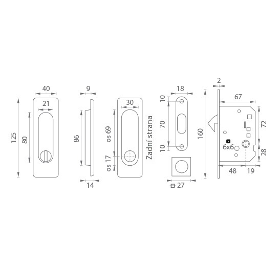 Rozteč: 70 mm (vzdálenost mezi otvorem na kliku a vložkou / klíčem)