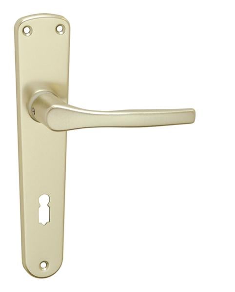 Štítová klika na interiérové dveře s oválným štítem je vyrobena z hliníku a je povrchově upravena. Oválný štít má rozměry 42 mm x 206 mm a klika neobsahuje vratný mechanismus.
