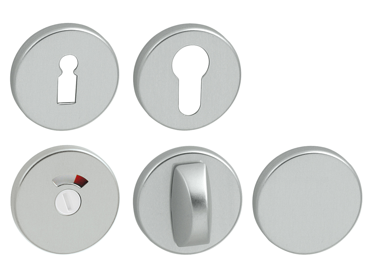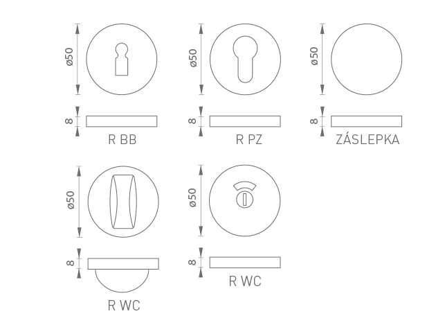 Kulatá rozeta je vyrobena z hliníku a je povrchově upravena. Rozeta má průměr 50 mm, tloušťku 8 mm a oválný otvor pro interiérový klíč (BB), otvor pro cylindrickou vložku (PZ), WC set s vmontovaným klíčem a ukazatelem nebo rozeta bez otvoru tzv. záslepka. Balení obsahuje 2 kusy rozet (pár) a rozety WC jsou v balení jako set.