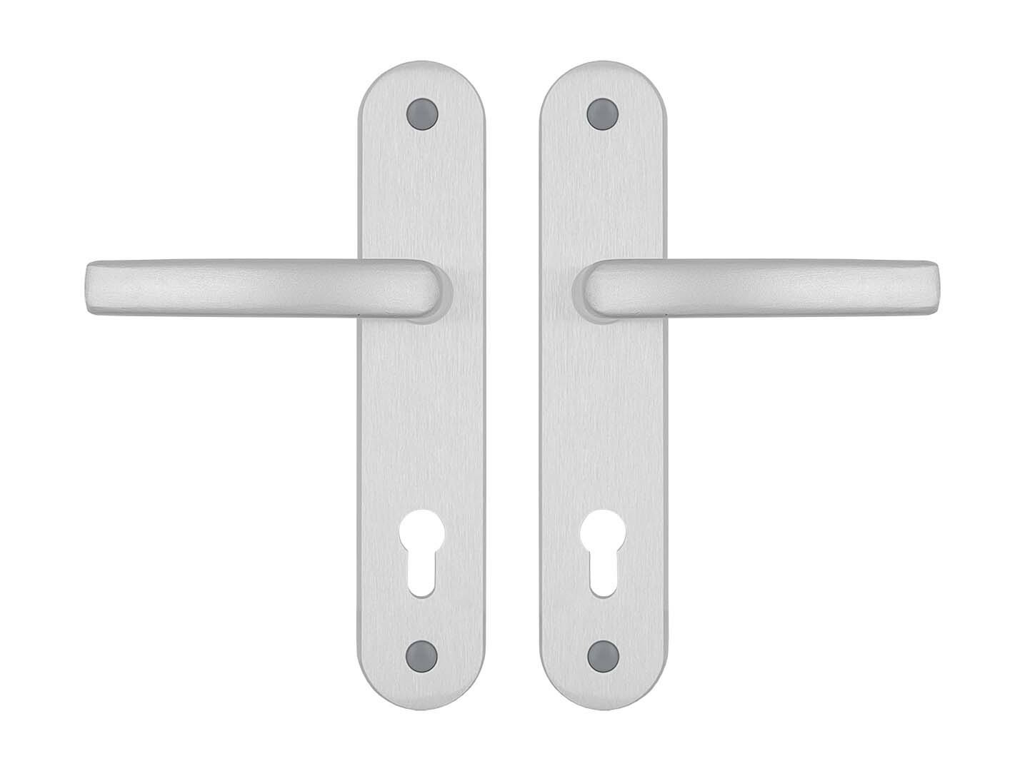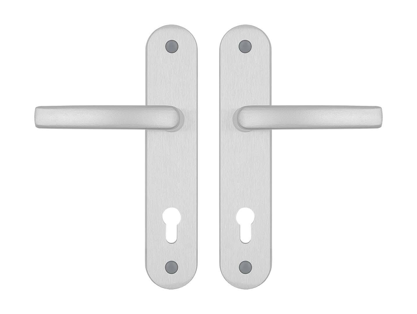 Štítová klika na vchodové a bezpečnostní dveře se zpevněným oválným štítem bez překrytí cylindrické vložky je vyrobena z hliníku a je povrchově upravena. Oválný štít má rozměry 50 mm x 248 mm a tloušťku 6 resp. 15 mm